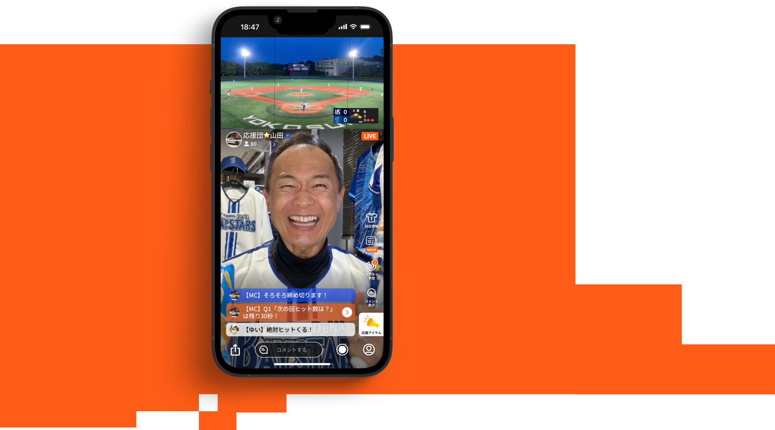 予想投票機能で試合展開をみんなで予想して盛り上がる!MCがオリジナルの問題を出題することも可能です。