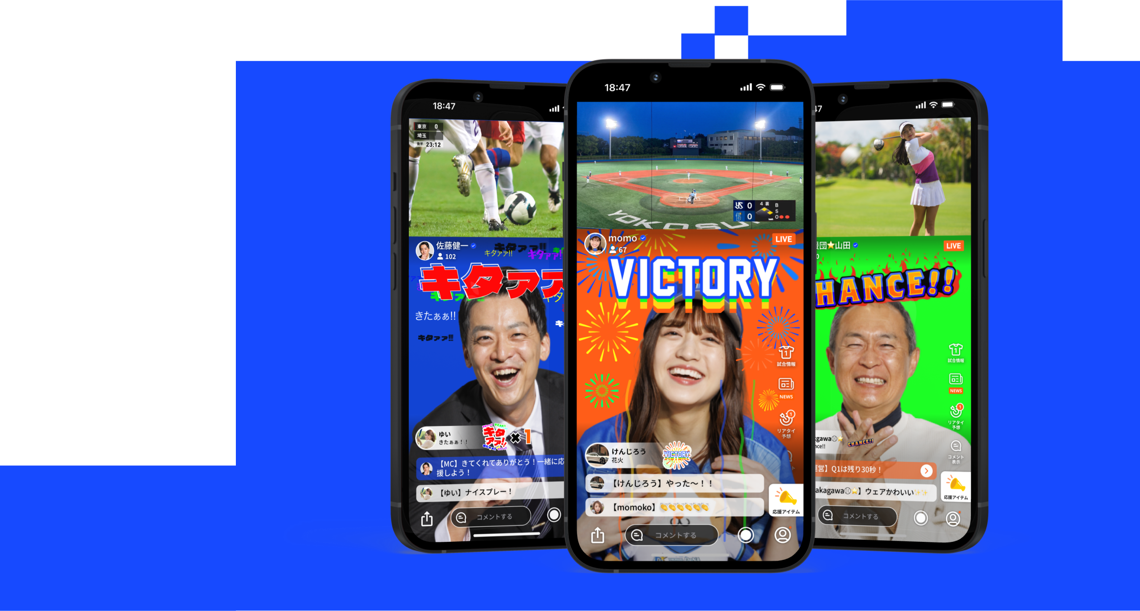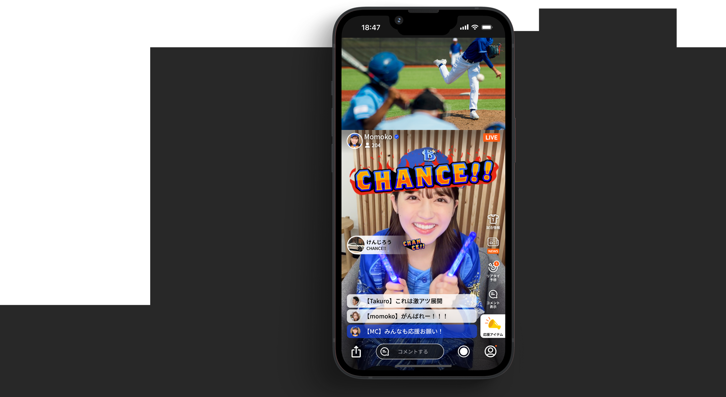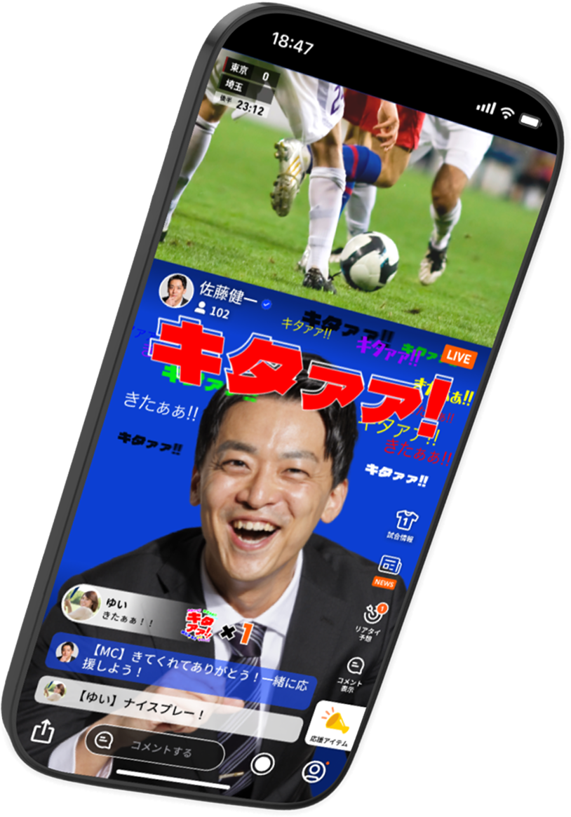 元プロから一般ファンまで誰でも配信!1つの試合を様々なタイプのMCと試合映像を一緒に見ながら応援できます。